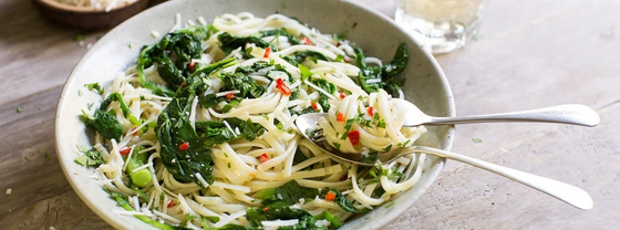Season with salt, pepper and a squeeze of lemon juice. Drain the pasta and fold it into the pan of greens. Serve piled into shallow bowls and finish with plenty of grated Parmesan and good olive oil.